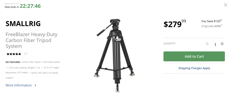 The SmallRig FreeBlazer Heavy-Duty Carbon Fiber Tripod System is on sale for $279.99 USD which is a saving of $120 USD.