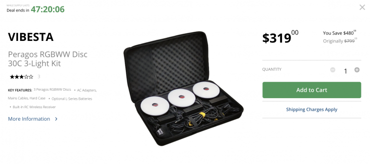The Vibesta Peragos RGBWW Disc 30C 3-Light Kit is on sale for $319 USD which is a big saving of $480 USD.