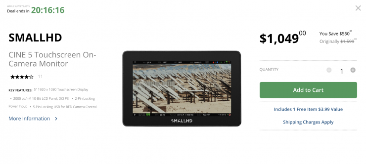 The SmallHD CINE 5 Touchscreen On-Camera Monitor is on sale for $1,049 USD, which is a discount of $550 USD.