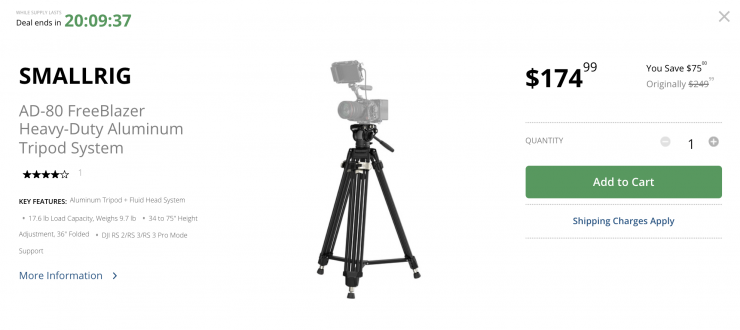 The SmallRig AD-80 FreeBlazer Heavy-Duty Aluminum Tripod System is on sale for $174.99 USD which is a discount of $75 USD.