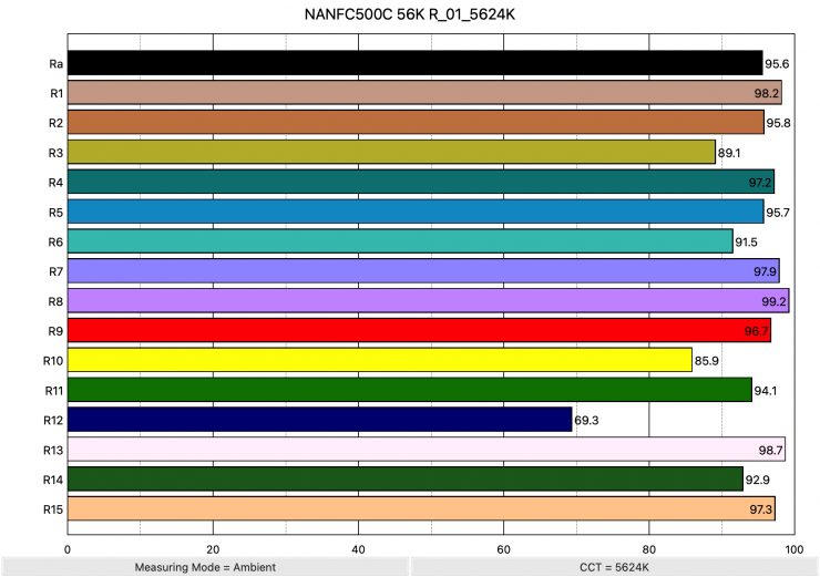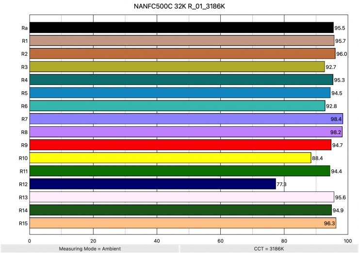 In this graph, the red bars indicate a perfect Planck 3200K source. The gold bars indicate a perfect 3200K Tungsten source. This lets us compare how close to a perfect 3200K lighting source the FC-500C is. Any SSI score in the high 70’s, low ’80s is very good for a 3200K LED light.