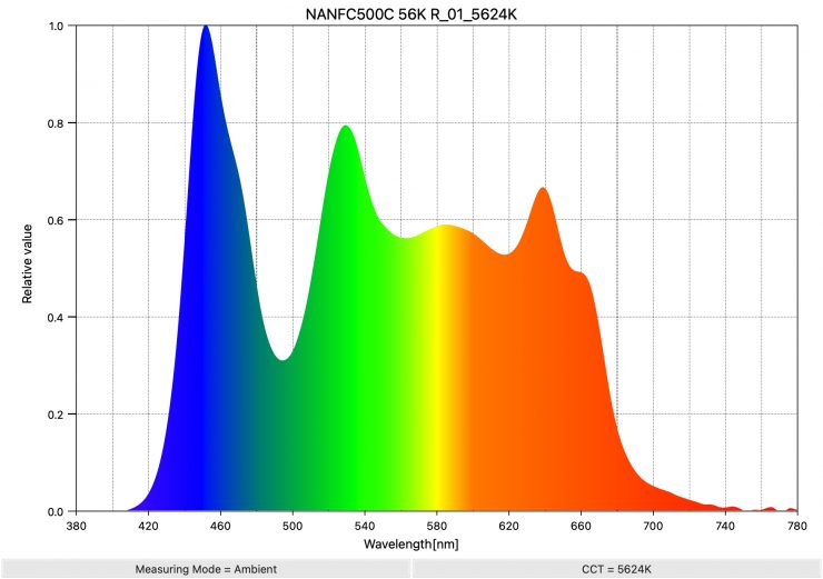 Above you can see the spectral distribution of the FC-500C when it is set at 5600K. The spectral distribution was a little all over the place and you can see a noticeable green spike.