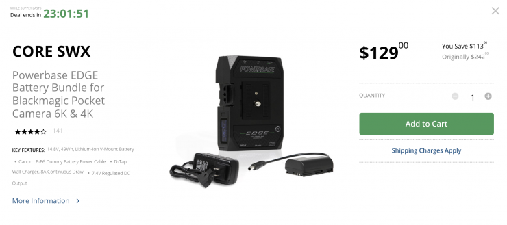 The Core SWX Powerbase EDGE Battery Bundle for Blackmagic Pocket Camera 6K & 4K is on sale for $129 USD, which is a discount of $113 USD.