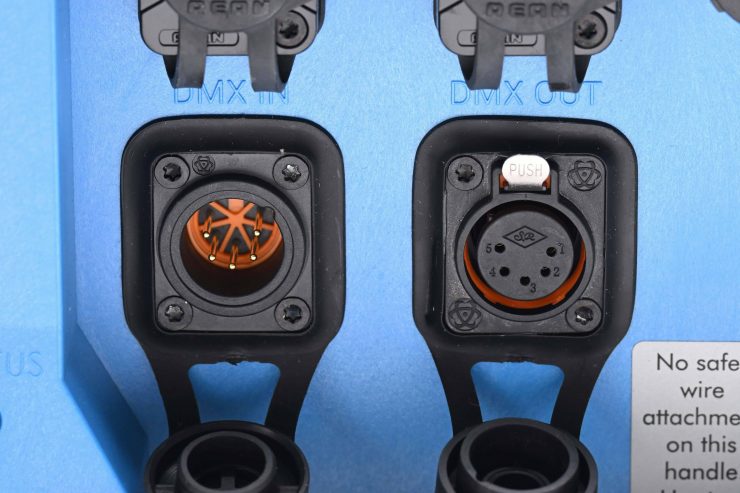 Conventional DMX and RDM communication via two 5-pin XLR DMX ports.
