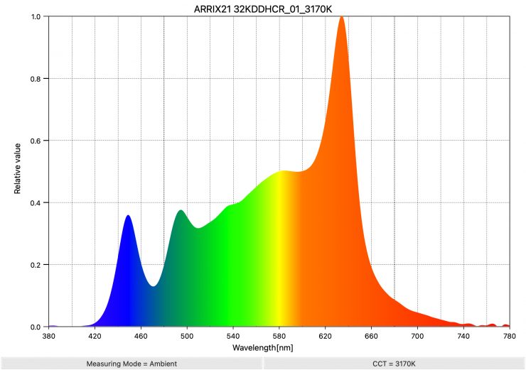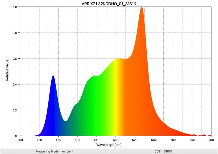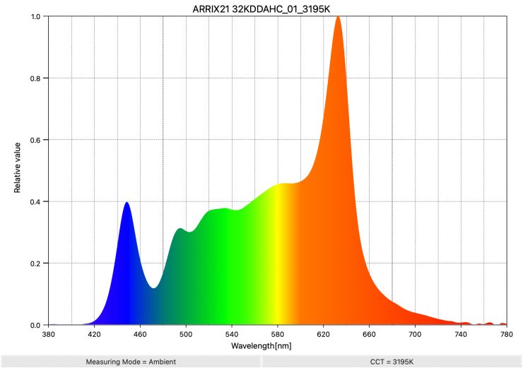 Above you can see the spectral distribution of the SkyPanel X21 when it is set at 3200K. The spectrum is not overly full.