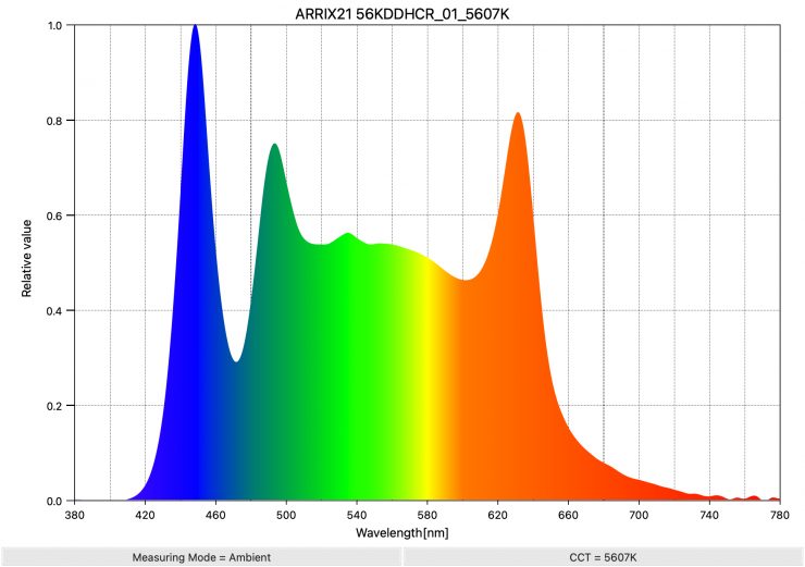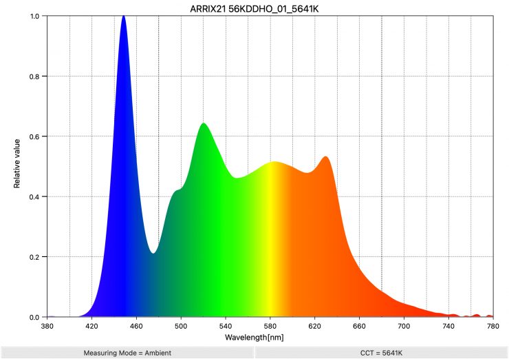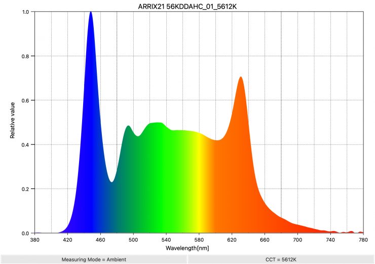 Above you can see the spectral distribution of the SkyPanel X21 when it is set at 5600K. As you can clearly see the light has quite a full spectrum, however, there are a couple of spikes.