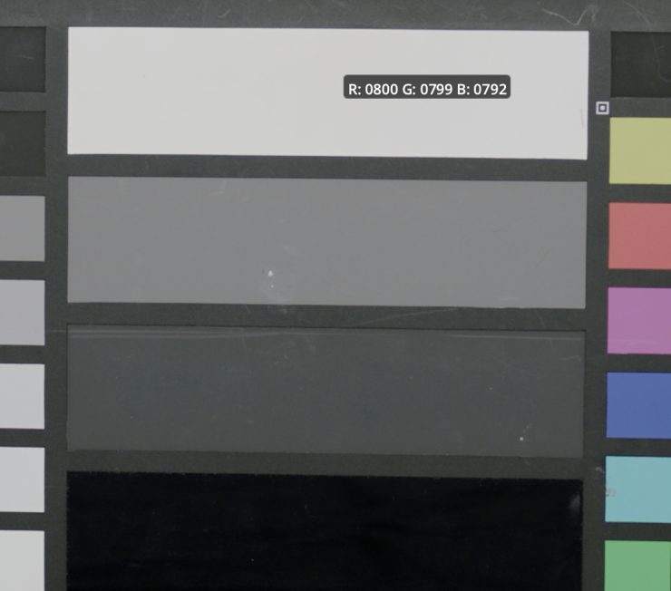 Above you can see that if we zoom in on white and look at the RGB color picker values in Resolve, white was basically spot on. I have also included the same shot when a preset WB was used so you can see the difference.