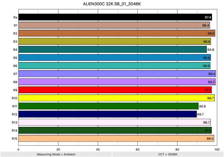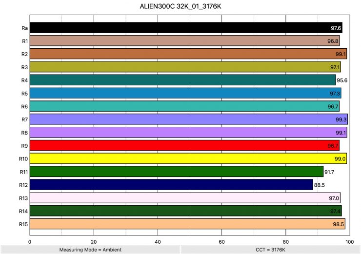 As you can see neither light is that close to being a perfect match to the Alien 300C at 3200K, although with a bit of fine-tuning you could probably get them to work together without any big issues. A score in the high 80s is still pretty good.