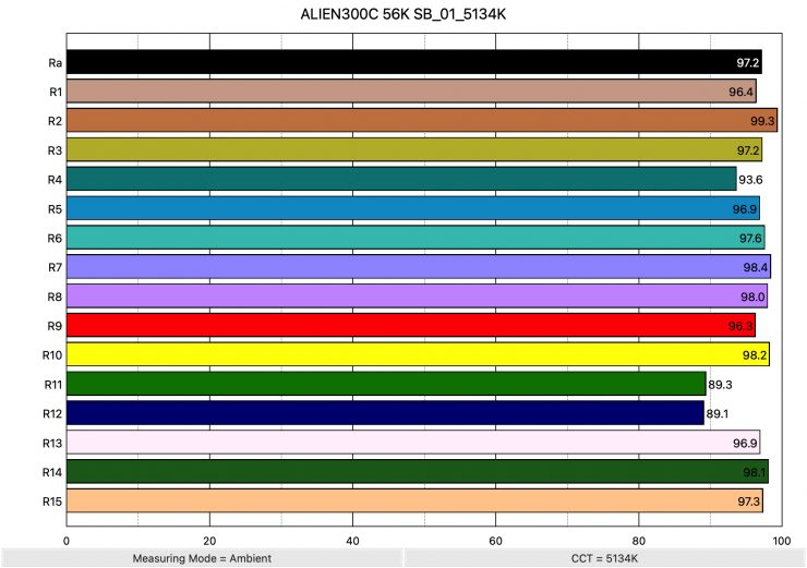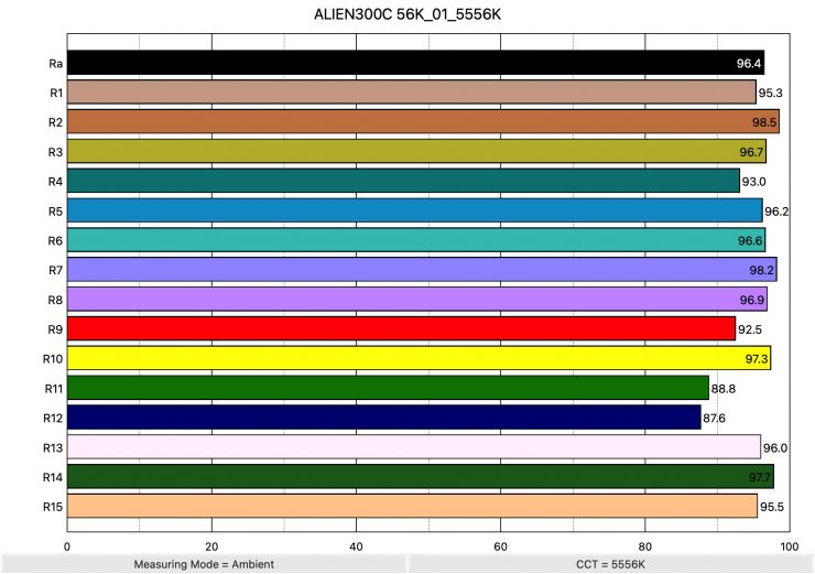 In the graph above the gold bars indicate a perfect CIE D55 source. The red bars indicate a perfect CIE D 5600K source. This lets us compare how close to a perfect 5600K lighting source the Alien 300C is. A score in the low 70’s is typical for a 5600K LED source.