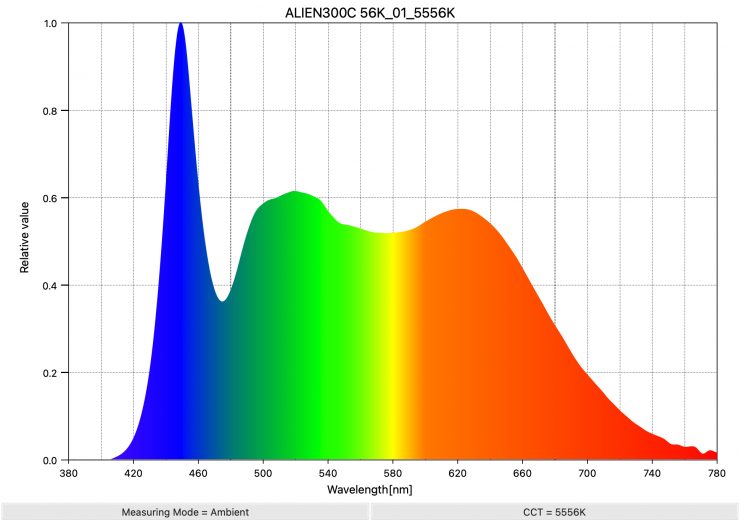 Above you can see the spectral distribution of the Alien 300C when set at 5600K. The spectral distribution is fairly standard for an LED light.