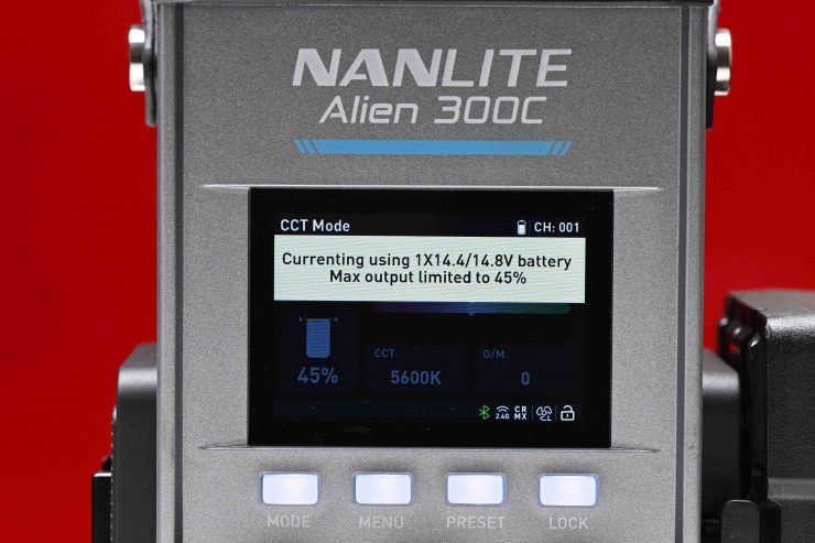 The Alien 300C can be powered via a single camera battery, however, it will only run at a maximum output of 45%.