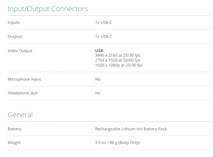 The HERO 4K features an integrated battery that can’t be swapped out. The battery will last for up to 1 hour. It can be charged via USB-C.