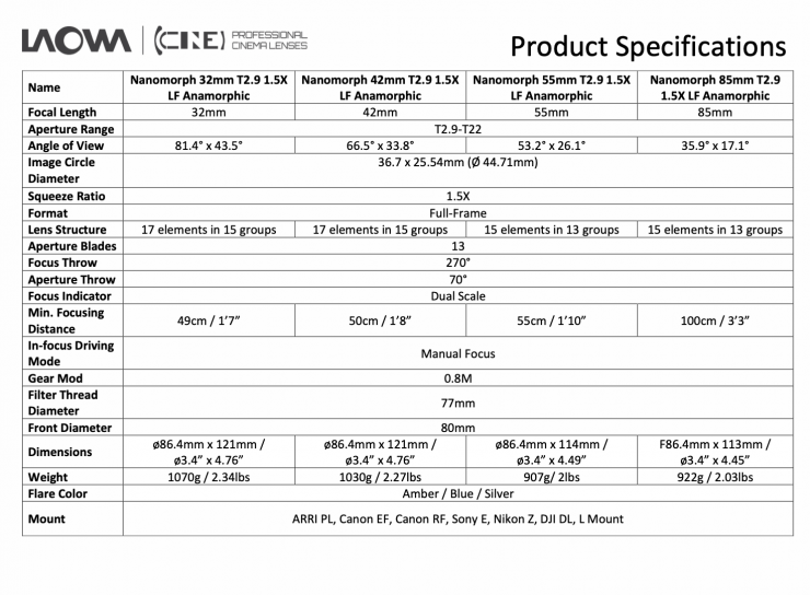 Laowa has announced its new Nanomorph 1.5X Anamorphic LF series that can cover the ARRI Alexa LF open gate sensor.