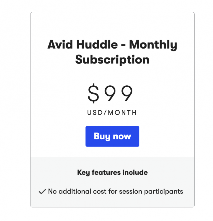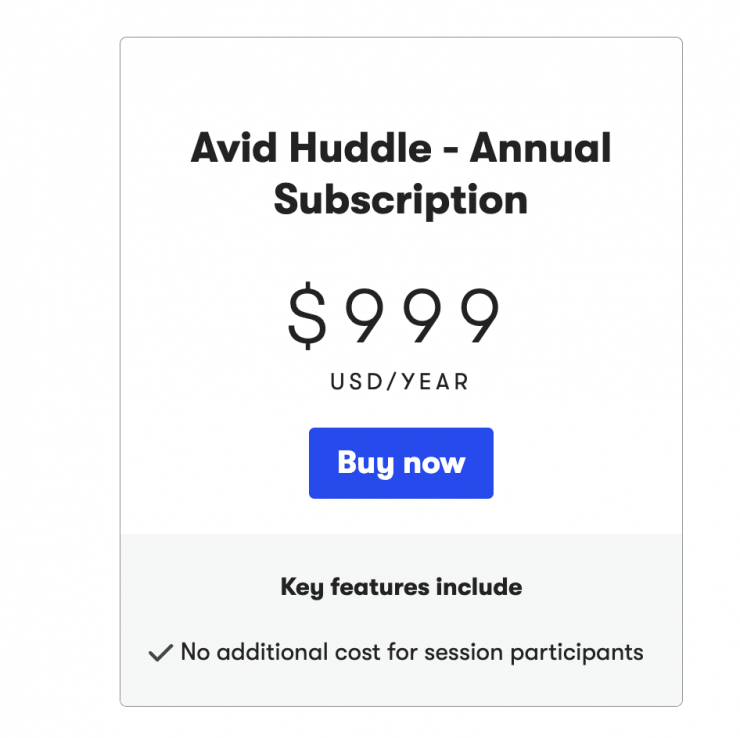 Avid Huddle is a subscription-based product and an individual annual license is $999 USD or $99 USD/month.