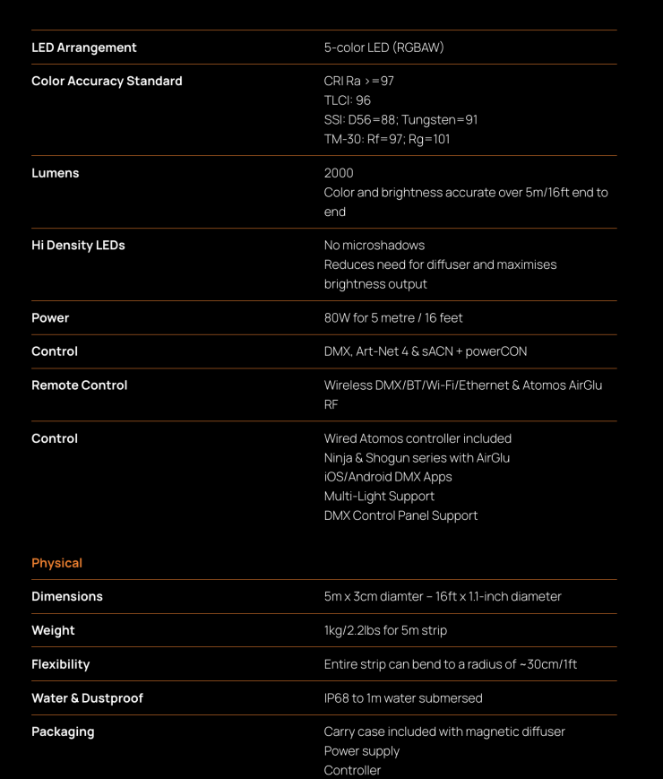 Sun Dragon is 2000 Lumens with a stated CLI of 99+, a TLCI of 98, and RGBAW for full-color with 5 different colored diodes—red, green, blue, amber, and white. This, combined with Atomos’ electronic control, allows for nearly any hue on the color wheel to be mixed during operation.