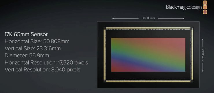 The URSA Cine 17K features a whopping 65mm sensor. With a horizontal size of 55.9mm and a vertical size of 23.32mm. It is smaller than the IMAX 70mm 15-perf size. The diameter of the URSA Cine 17K sensor is 55.9mm with a resolution of 17,520 x 8,040 pixels.
