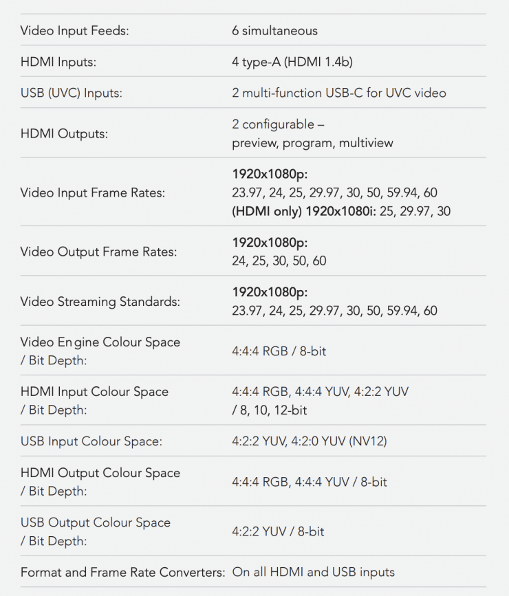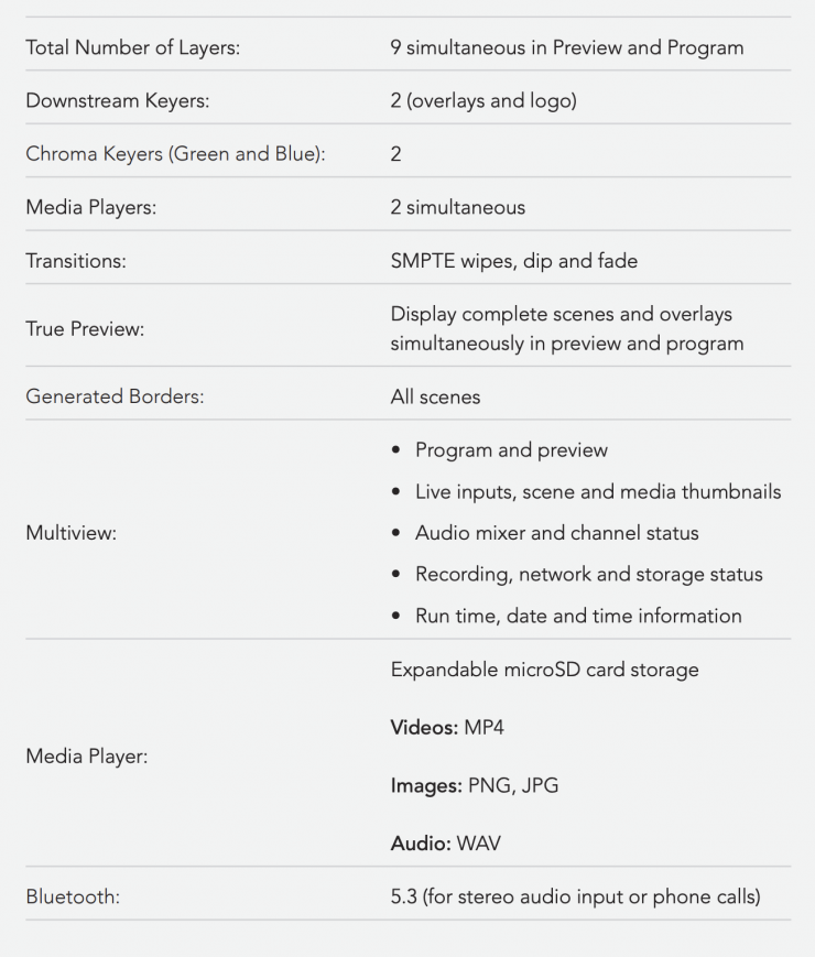 - High-performance octa-core CPU with a next-generation video engine, built from the ground up, allows for an innovative scene-based architecture that makes it super simple to create, configure and switch between complex multi-source layouts