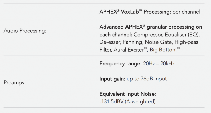 - Powerful APHEX® audio processing, including an EQ, compressor, noise gate, high-pass filter, de-esser and the legendary Aural ExciterTM, Big BottomTM and CompellorTM effects