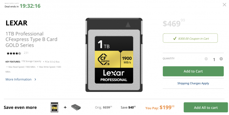 The Lexar 1TB Professional CFexpress Type B Card GOLD Series is on sale for $169.99 USD which is a discount of $300 USD.