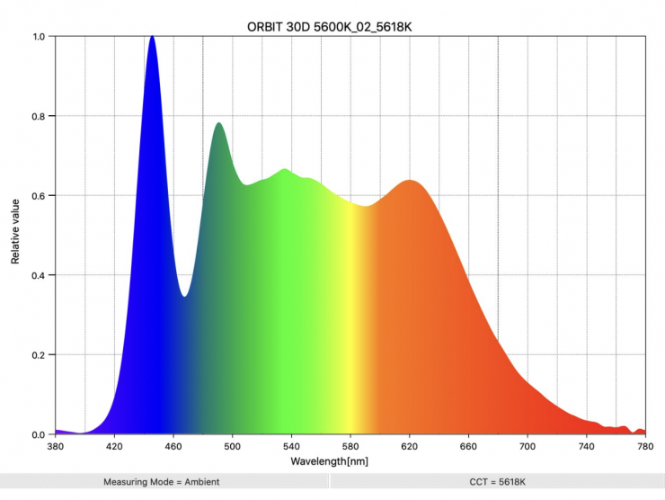 If we look at an LED light that isn’t utilizing this type of technology, such as the ARRI Orbiter, we can see the difference in the spectrum.