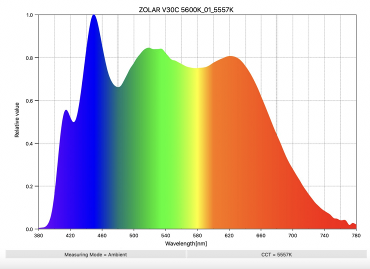 If we have a look at a full-spectrum fixture that is doing something similar, in this case, the ZOLAR Vega 30C, you can see there is extra information at around 400nm. You can also see why this translates to high SSI scores.