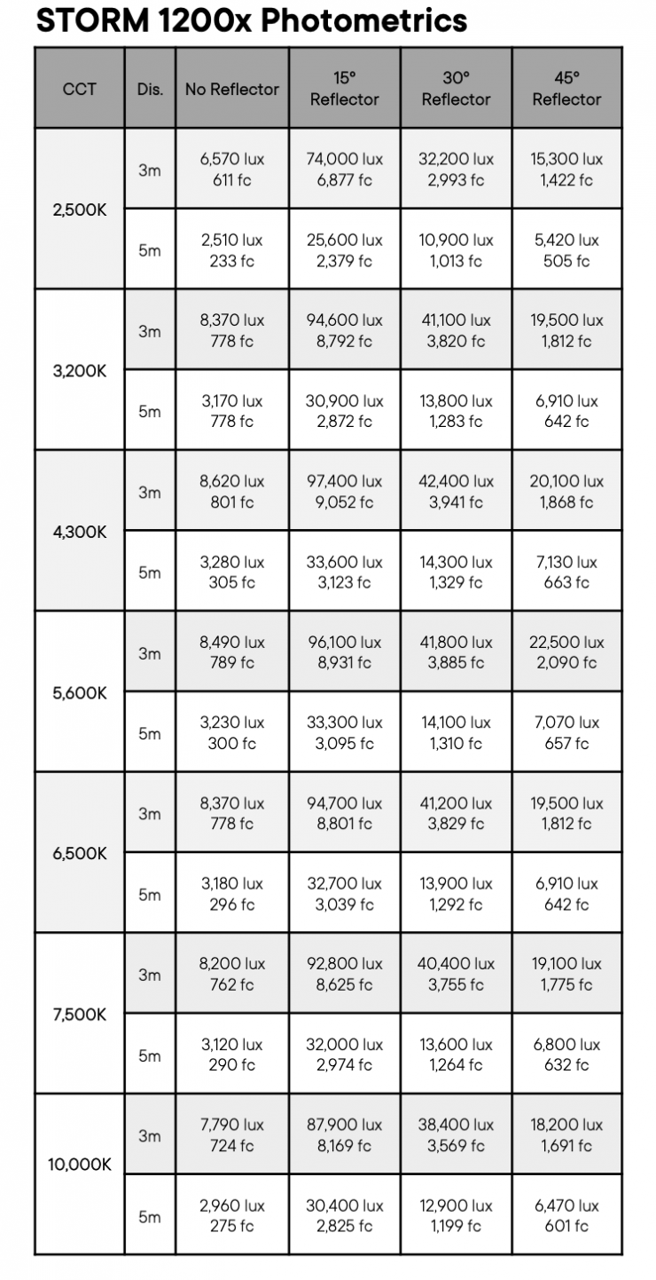 Aputure STORM 1200x 5600K Max. Output Mode (Wide reflector 45°)