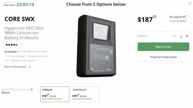 The Core SWX Hypercore NEO Slim 98Wh Lithium-Ion Battery is on sale for $187 USD, which is. discount of $130 USD. The battery is available in V-mount or Gold mount.