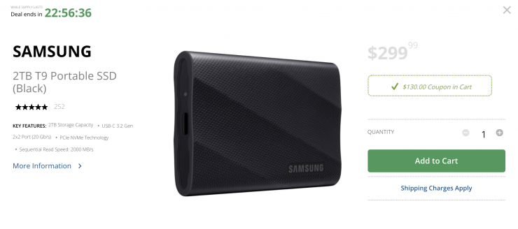 The Samsung 2TB T9 Portable SSD is on sale for $169.99 USD which is a saving of $130 USD.