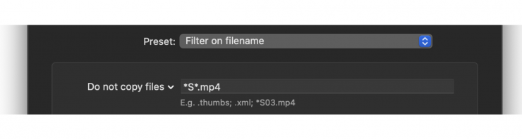 OffShoot’s file extension filters help ensure you only offloaded the required files. As both Z-CAM and SONY have cameras that can record both full-quality and low resolution versions of the same clip, even more control is needed for proxy workflows. In OffShoot 24.4, you can extend the “Copy only” and “Do not copy” filters to files with a specific character or sequence in their filenames.