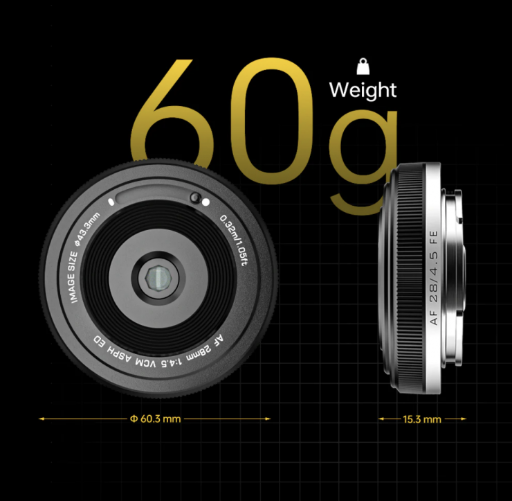 Weighing just 60g and measuring 15.3mm thick, the Viltrox AF 28mm F4.5 lens is the lightest and thinnest lens ever made by Viltrox.