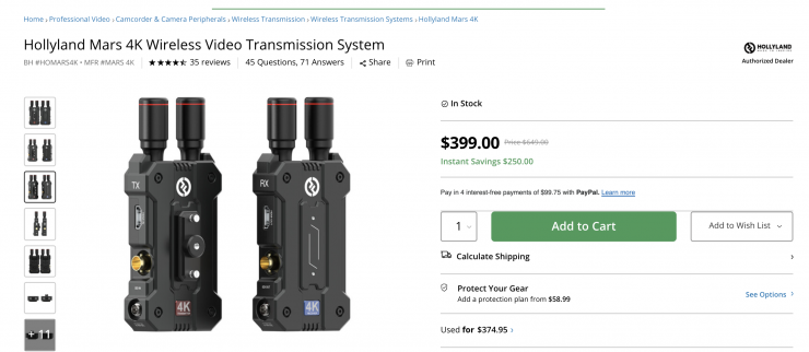 The Hollyland Mars 4K Wireless Video Transmission System is on sale for $399 USD, which is a discount of $250 USD.