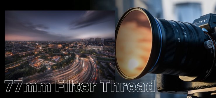The lens also features a 77mm front filter thread, which can be used when the lens hood is attached.