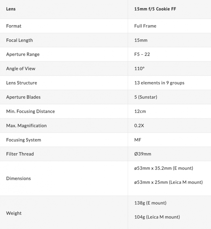 The new Laowa 15mm f/5 Cookie FF Lens weighs only 158g and it offers a very wide 110° angle of view. The lens is available in Canon RF, Leica L-mount, Leica M-mount, Sony E-mount, and Nikon Z-mount.