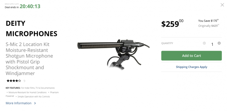 The Deity Microphones S-Mic 2 Location Kit Moisture-Resistant Shotgun Microphone with Pistol Grip Shockmount & Windjammer is on sale for $259 USD, a discount of $170 USD.