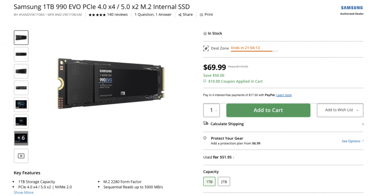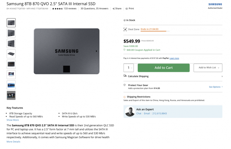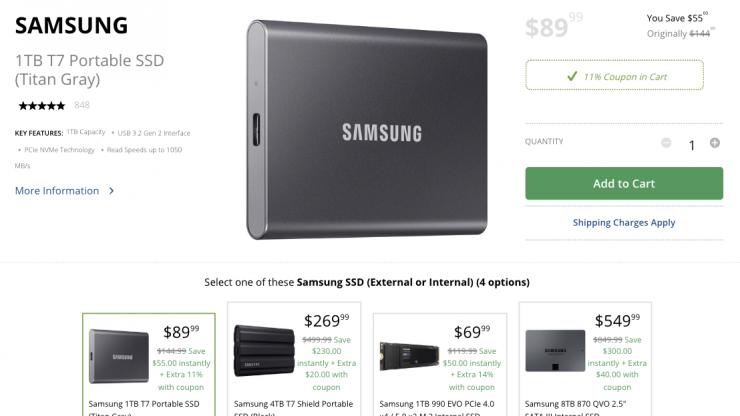 The Samsung 1TB and 4TB T7 SSD drives, 1TB 990 EVO PCIe 4.0 x4 / 5.0 x2 M.2 Internal SSD, and 8TB 870 QVO 2.5″ SATA III Internal SSD are all on sale.