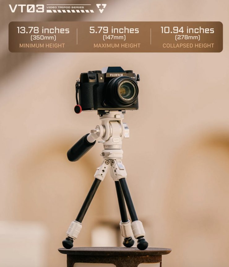 The Tabletop Video Fluid Head with 1-Stage Carbon Fiber Tripod Legs VT03 is a versatile and compact tripod designed for portability.