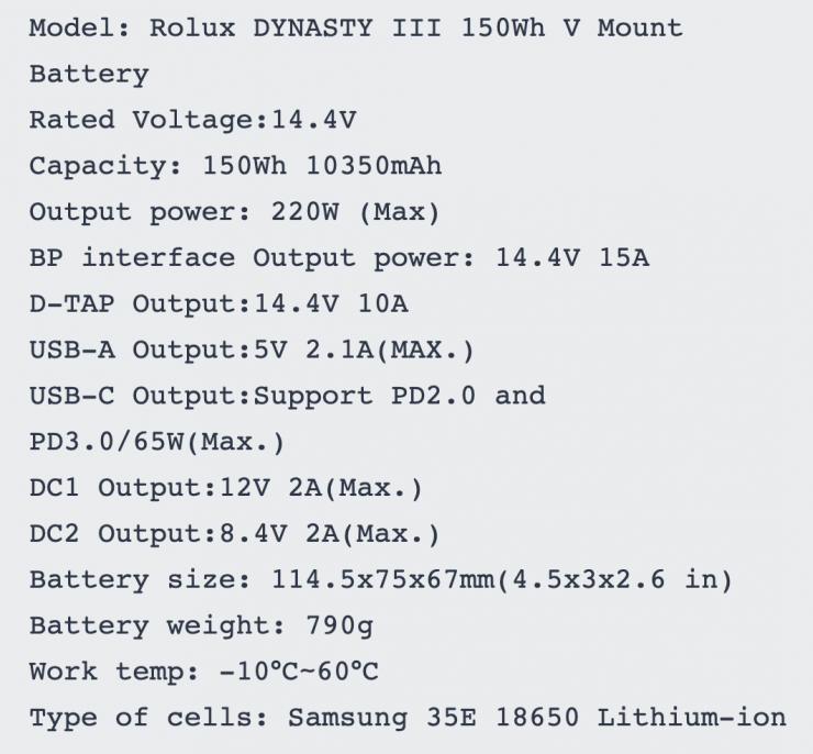 The Rolux Dynasty III is a 150Wh 14.5V V-Mount Battery that features D-tap, USB-C input/output, and DC barrel outputs.