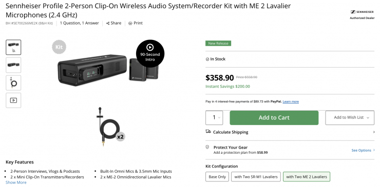The newly released Sennheiser Profile 2-Person Clip-On Wireless Audio System/Recorder Kit with ME 2 Lavalier Microphones (2.4 GHz) is on sale for $358.90 USD, which is a discount of $200 USD.