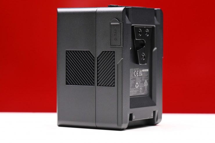 The D-Tap output can be used to power lights, a monitor, a recorder, or other accessories. It is located on the right side of the battery and it has an output of 16.8V 8A / 14.5V 14A. I would have preferred to have seen two D-tap outputs on a battery of this size.