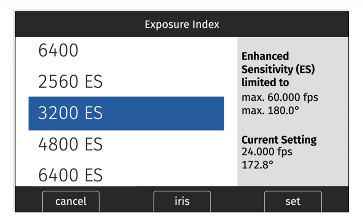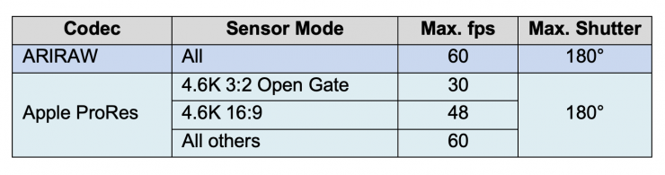 ES computing takes place right after the sensor before the image is made into an MXF/ARRIRAW or debayered into Apple ProRes files. Enhanced Sensitivity has some frame rate and shutter limitations (see table below). The shutter time can always be decreased in duration but is limited to a maximum value of 180 degrees. This means that it is possible to be in Enhanced Sensitivity mode while using a 144-degree shutter to mitigate flicker for instance. The ability to record with a 360-degree shutter while using Enhanced Sensitivity mode is not possible.