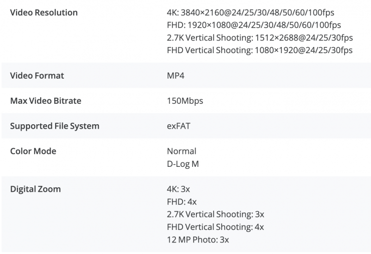 The maximum bitrate is 150Mbps and videos are recorded in the MP4 format.