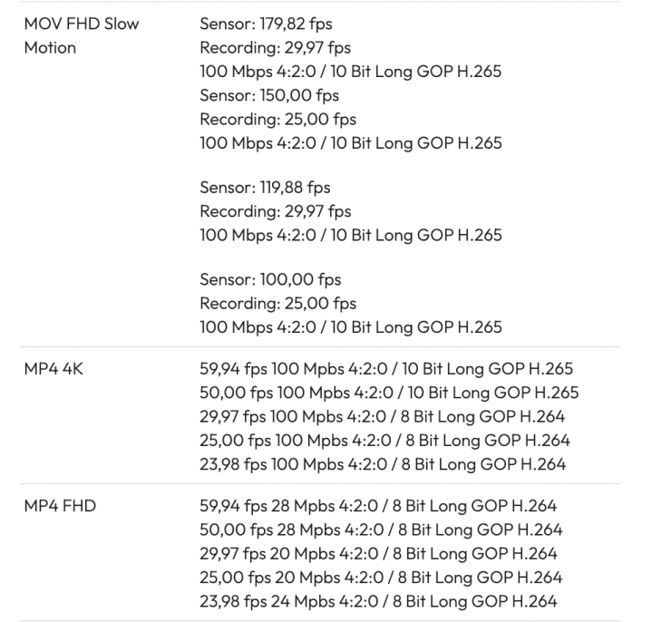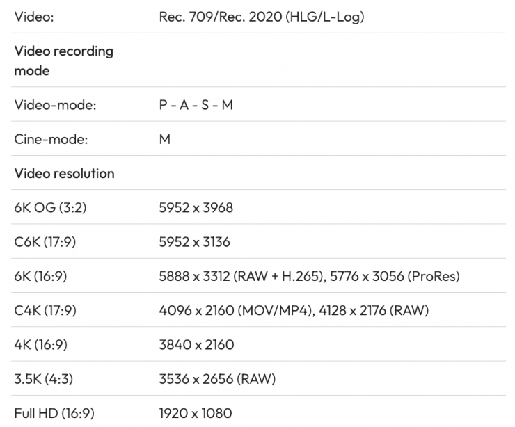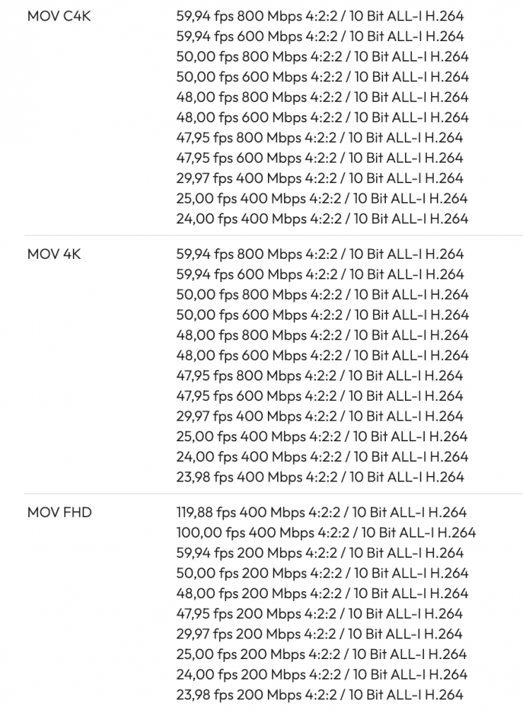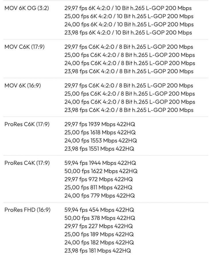 The camera can also record in UHD in H.264/H,265, H.264 ALL-Intra 4:2:2 10-bit, and ProRes 4:2:2 at 5792 x 3056 at 23.98/24.00/25/29.97 fps [1551 to 1939 Mb/s], 4096 x 2160 at 25/29.97/50/59.94 fps [811 to 1944 Mb/s], 1920 x 1080PsF at 23.98/24.00/25/29.97/50/59.94 fps [181 to 454 Mb/s].