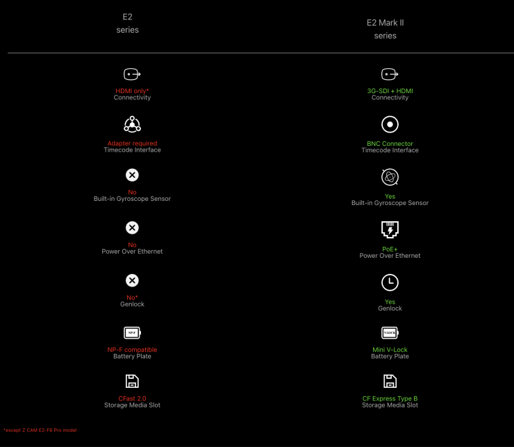 The E2 Mark II cameras now have SDI and HDMI, as opposed to just HDMI, and a proper BNC timecode port and genlock. There is also a built-in gyroscope sensor, PoE+ (power over ethernet), and mini V-lock battery plates, as opposed to Sony NP-F. The media storage has changed from CFast 2.0 to CFexpress Type B.