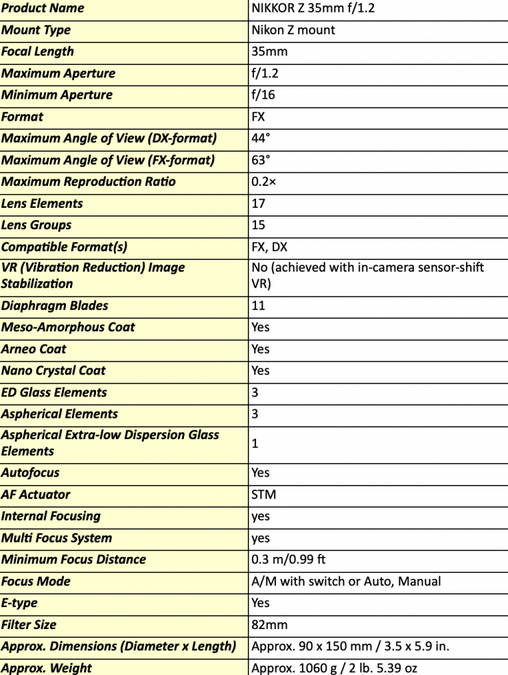 Primary Features of the NIKKOR Z 35mm f/1.2 S