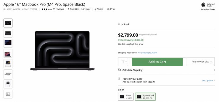 The Apple 16″ Macbook Pro (M4 Pro, Space Black) is on sale for $2,799 USD, which is a discount of $300 USD.