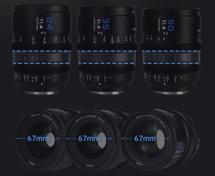 The SIRUI VISION PRIME T1.4 Cine Lens Series consists of three focal lengths, 24mm, 35mm, and 50mm. All three lenses have a T1.4 aperture.