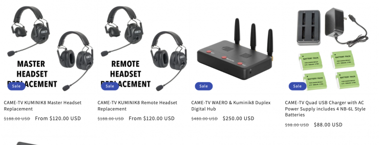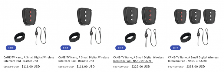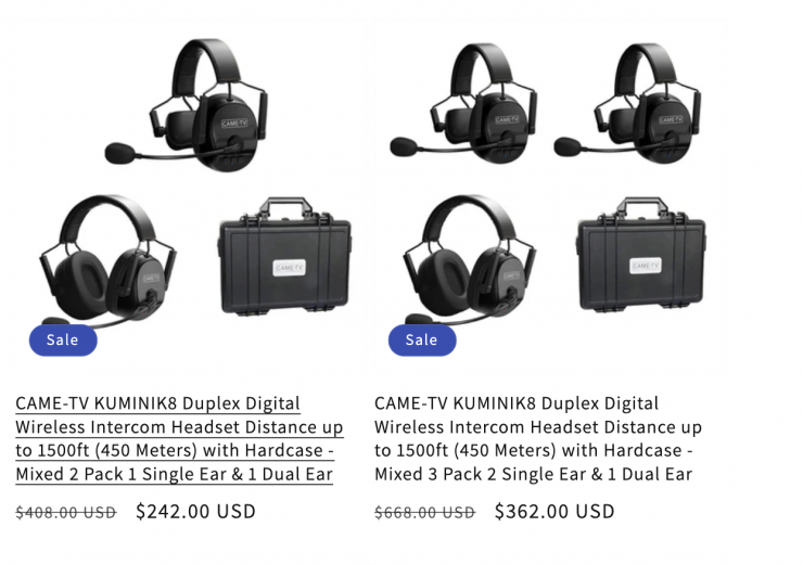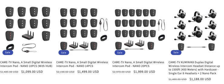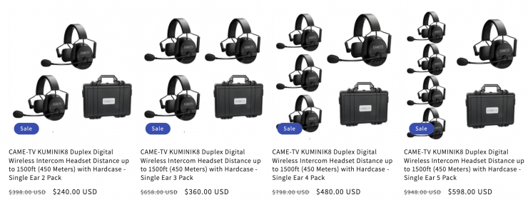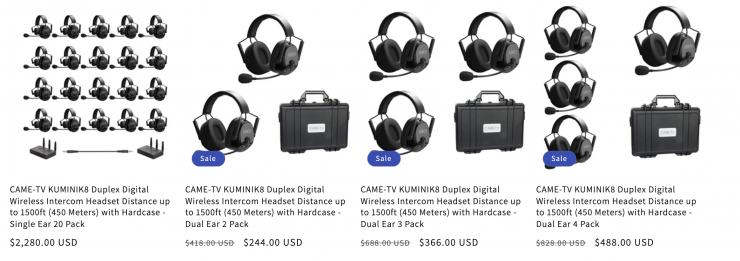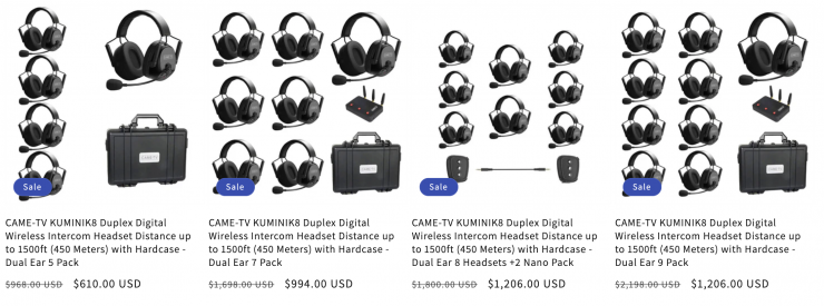 The CAME-TV WAERO Pro Full Duplex Dual Antenna 1.9G Lightweight Wireless Intercom Headsets start at $220 USD for a 2-pack and go up to $999 USD for a 9-pack.