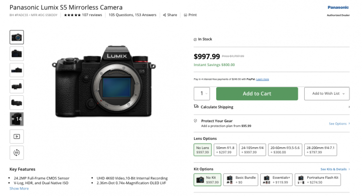 The Panasonic Lumix S5 is on sale for $979.99 USD, which is a discount of $800 USD.