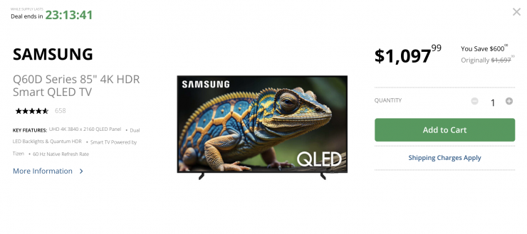 The Samsung Q60D Series 85″ 4K HDR Smart QLED TV is on sale for $1,097.99 USD, which is a discount of $600 USD.