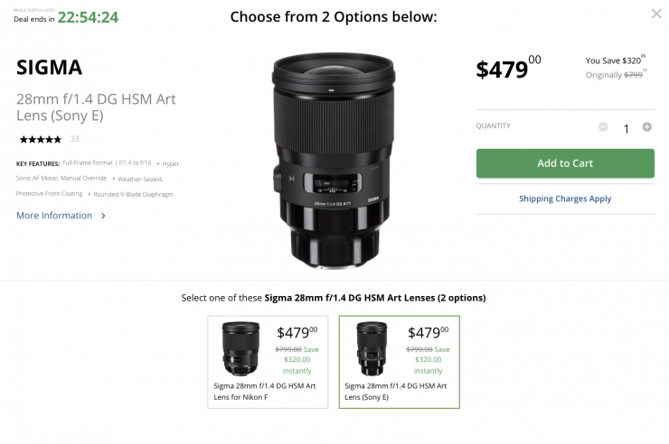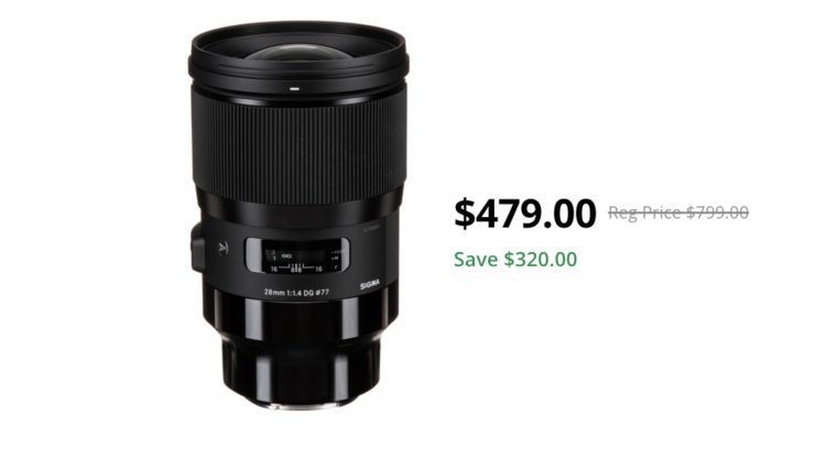 The Sigma 28mm f/1.4 DG HSM Art Lens (Sony E) is on sale for $479 USD, which is a discount of $320 USD.